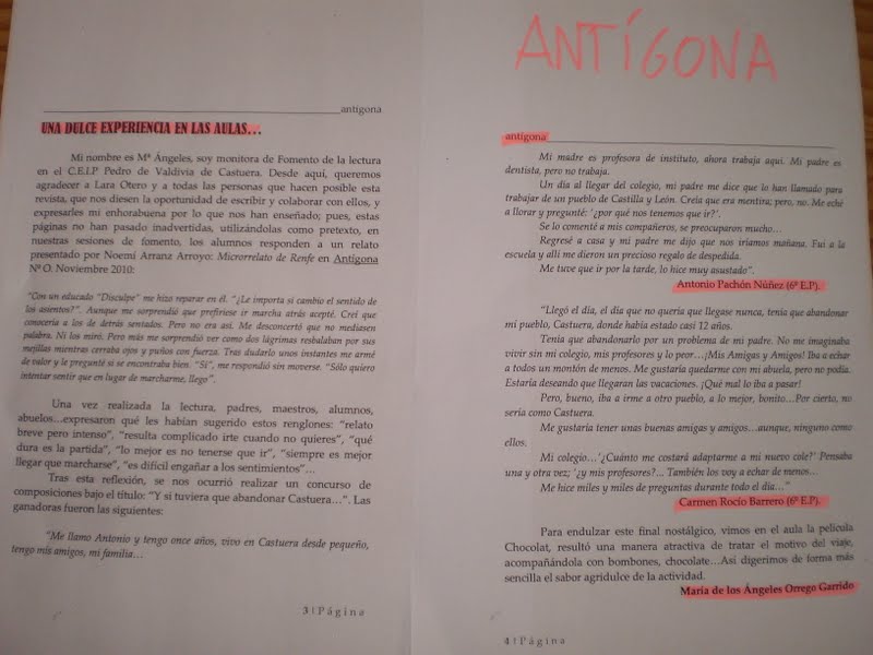 Para finalizar me gustaría destacar la ilusión de dos alumun@s por participar en un artículo en la revista Antígona. Una dulce Experiencia en las aulas.(María de los Ángeles Orrego Garrido)